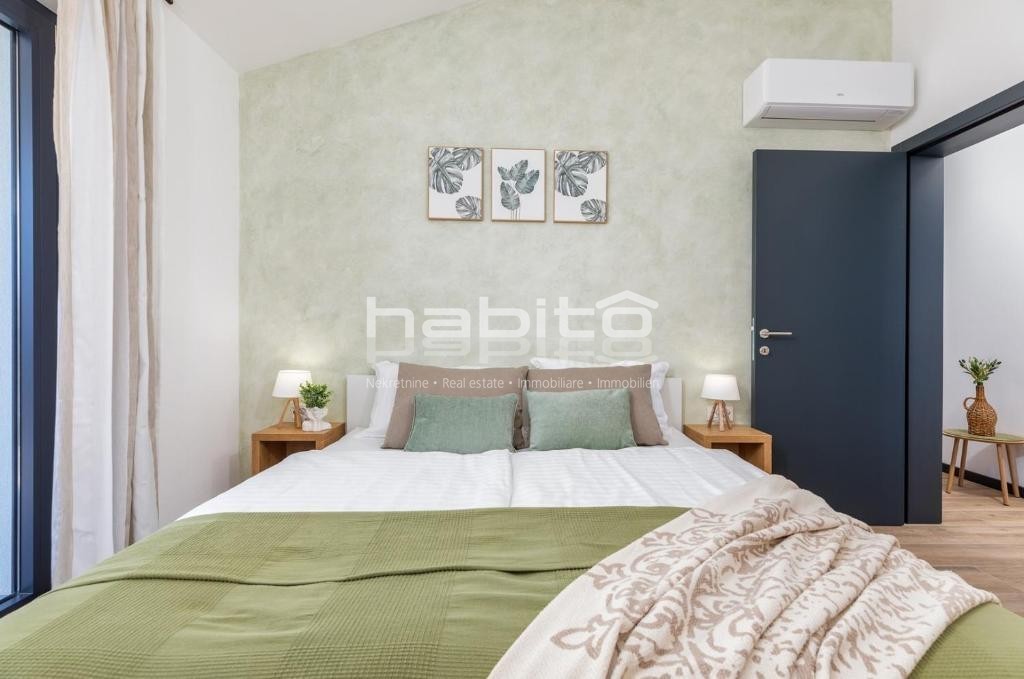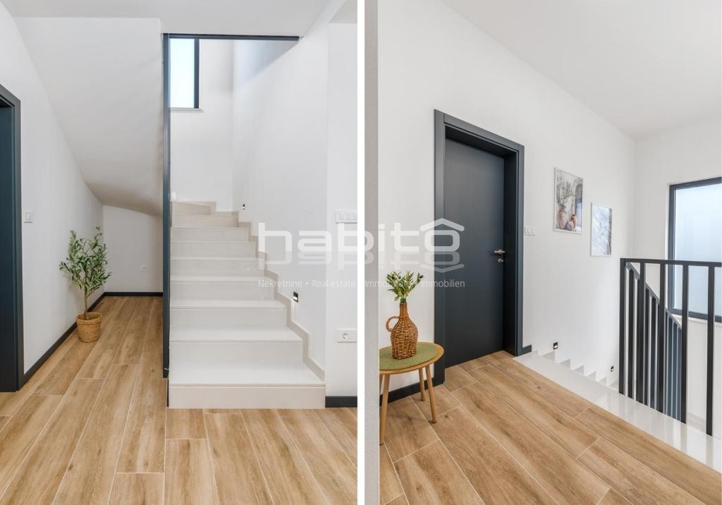 Kuća od 140 m2 sastoji se od prizemlja i kata a sadrži 3 spavaće sobe, 3 kupaonice, WC za goste te otvoreni prostor kuhinju, blagovaonicu i dnevni boravak s izlazom na natkrivenu terasu.