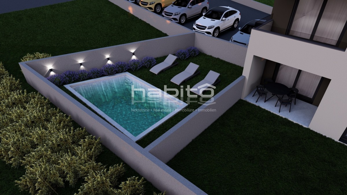 Posebnost ove nekretnine je zaseban ulaz te prostrani vrt od 80 m2, dok je za maksimalno uživanje osigurano korištenje bazena koji se dijeli sa samo jednim susjednim stanom.