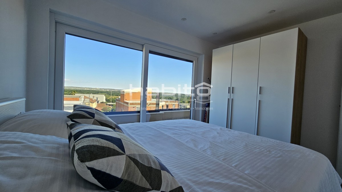 L'appartamento è composto da tre spaziose camere da letto e tre bagni modernamente attrezzati, garantendo privacy e comfort per tutti gli occupanti. Il cuore della casa è una ampia terrazza dotata di tenda elettrica, perfetta per rilassarsi e godere della vista panoramica sul mare e sul paesaggio circostante.